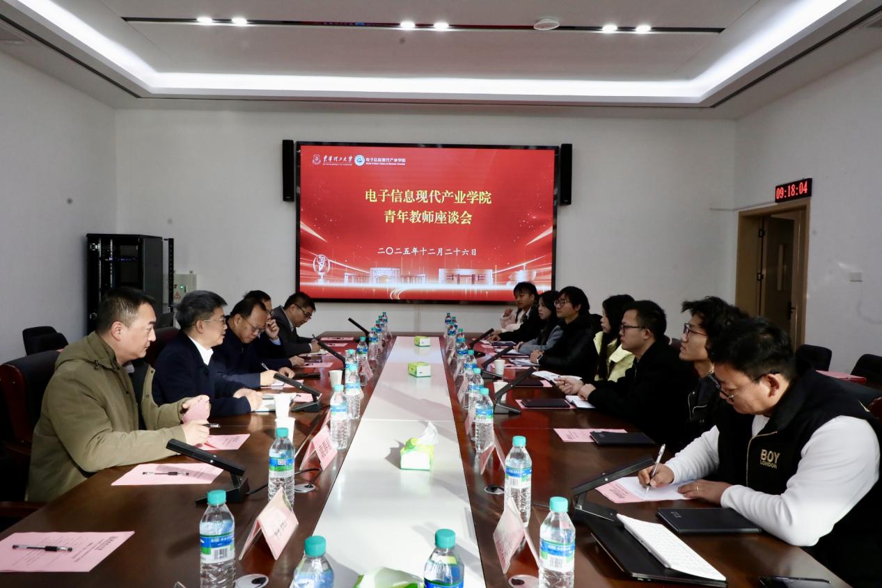 学校电子信息现代产业学院负责同志及青年教师代表参加座谈。(文/图 万佳琪 郭江涛)